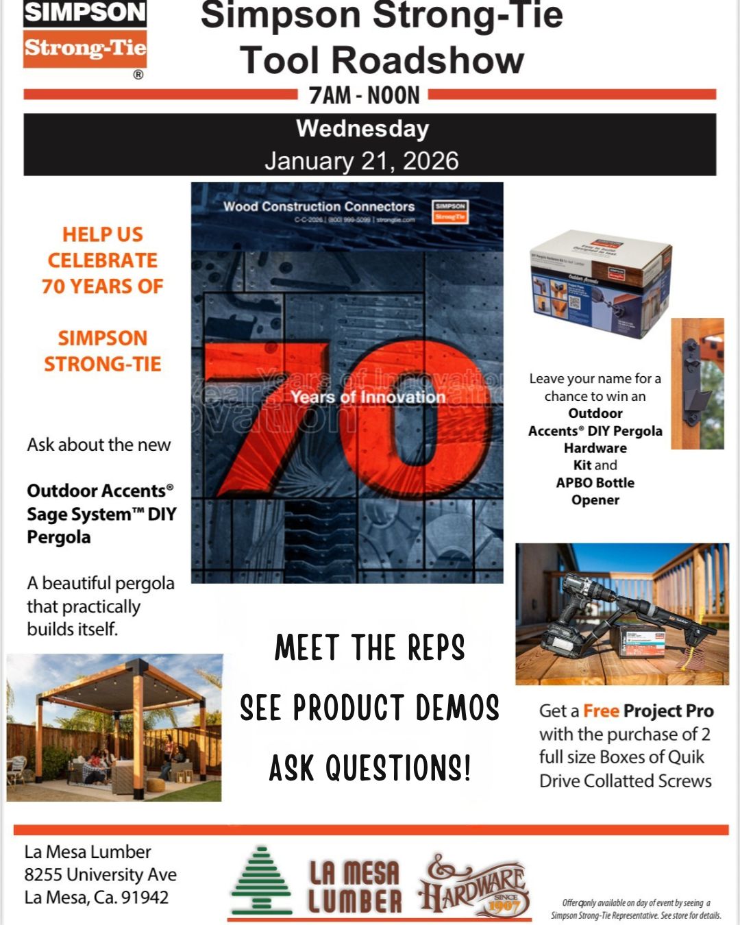 Simpson Strong-Tie Tool Roadshow: Wednesday, January 21st from 7 am - 12 pm. Meet the reps, check out product demos and ask your questions!